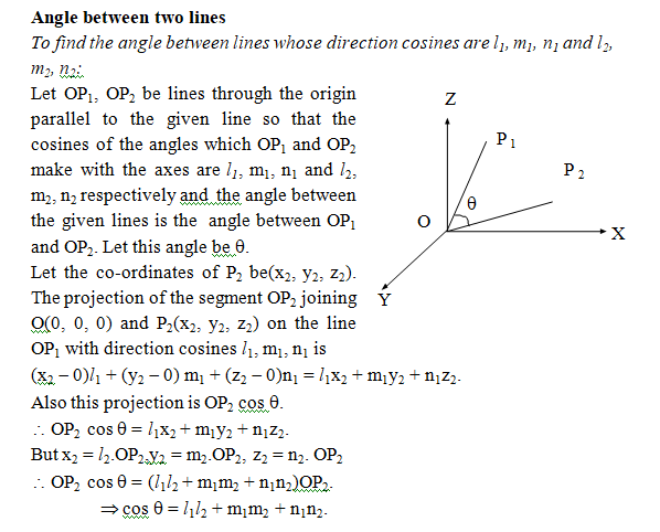 i.e., the sum of the squares of the direction cosines of every line is unity. Let OP be drawn through the origin parallel to the given line so that l, m, n are the cosines of the angles which the line OP makes with the co-ordinate axes OX, OY, OZ respectively.